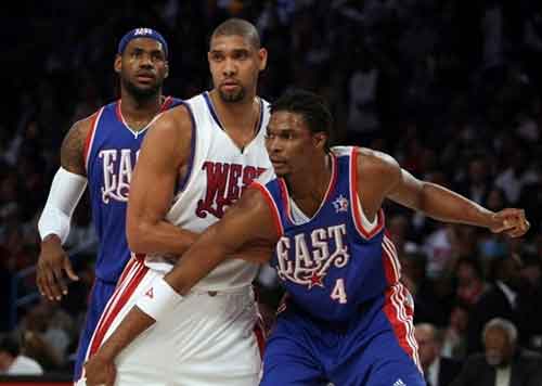 在首發(fā)陣容上,西部為姚明、鄧肯、安東尼、科比和艾弗森,東部則為霍華德、波什、詹姆斯、韋德和基德。