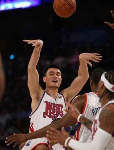 下半場(chǎng)開(kāi)始后,姚明重新回到場(chǎng)上。在西部隊(duì)的一次進(jìn)攻中,他手中的球飛到場(chǎng)外,剛好被功夫巨星李連杰得到,引發(fā)一片笑聲。中國(guó)巨人隨后在比賽里也開(kāi)始搞笑,連續(xù)在外圍出手,第一次投籃偏出,第二次干脆就來(lái)了個(gè)“三不沾”。三節(jié)打完,東部以106-93仍然保持領(lǐng)先。