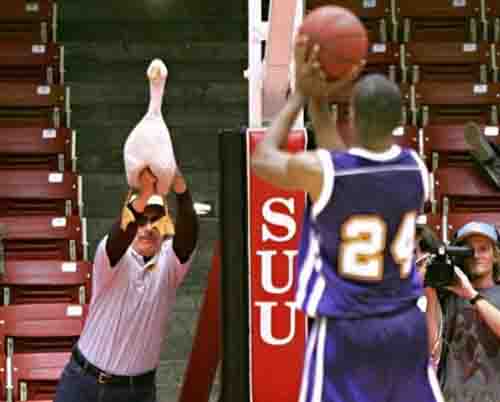 科比站上罰球線,眼睛拼盡全力盯著什么,卻久久不能投出這關(guān)鍵一球,他的心臟足以承受投籃不進帶來的后果,那么,到底發(fā)生了什么?當一名如此優(yōu)秀的籃球巨星站到罰球線而遲遲不能出手投籃結(jié)束比賽,肯定有他的原因,答案找到了:在科比走上罰球線的剎那間,他看到了來自觀眾席客隊球迷們?yōu)樗麥蕚涞镊吟汛蟛汀P球防火墻,一時間,美女照片、狂舞的塑膠棒、極具創(chuàng)意的搞笑漫畫,甚至可愛的鴨子都成了搞怪的最好道具。