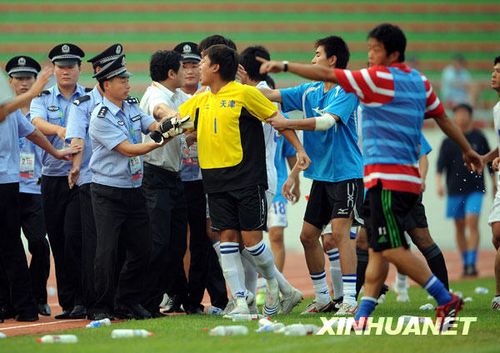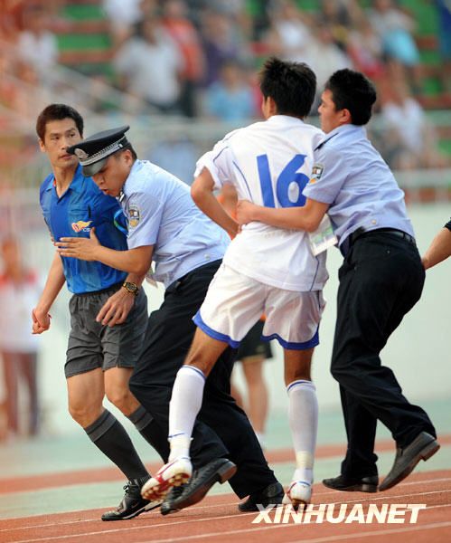 如果說賽后的追打是“大餐”的話,比賽進(jìn)行到90分鐘時14號劉青被何志彪紅牌罰下后的推搡動作則是“開胃小菜”。此前,天津隊的9號梁杰和10號馬磊磊已被紅牌罰下。當(dāng)梁杰因故意蹬踏被罰下的時候,天津隊門將李根跑到中圈附近的事發(fā)地點,邊質(zhì)問裁判邊高喊:“不踢了,不踢了!标爢T也都跟著李根往球場外跑。在主教練孫建軍的勸說下,球員才重新回到比賽當(dāng)中。