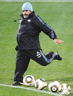 300名記者,上百支“長(zhǎng)槍短炮”,密密麻麻擠滿了訓(xùn)練球場(chǎng)的看臺(tái)。沒有梅西、伊瓜因,阿根廷人的訓(xùn)練并不寂寞。只因?yàn)橐粋(gè)人的存在,馬拉多納。沒有任何懸念,所有的風(fēng)頭,都被老馬一人搶光。