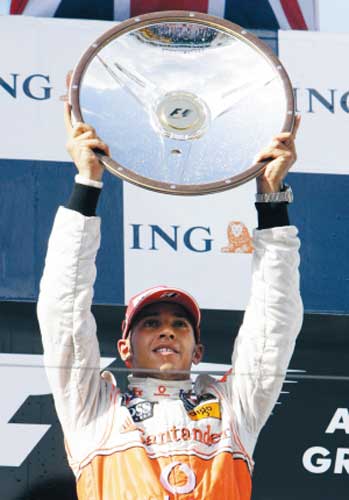 雖然事故頻發(fā),但邁凱輪車手漢密爾頓并未受到混亂形勢的影響,他駕駛著無TC(牽引力控制系統(tǒng))賽車順利登上了領(lǐng)獎臺最高處。
