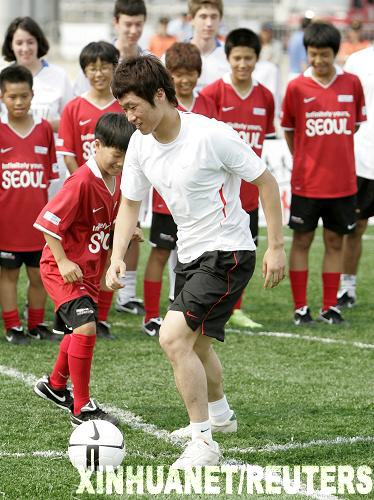 7月23日,英超曼聯(lián)隊(duì)的韓國球員樸智星在為孩子們展示運(yùn)球技巧。當(dāng)日,樸智星與韓國藝人Rain在首爾的一個(gè)足球訓(xùn)練營(yíng)為孩子們展示球技。樸智星所效力的曼聯(lián)隊(duì)于今日抵達(dá)首爾,繼續(xù)亞洲之行。球隊(duì)將于7月24日與首爾FC隊(duì)進(jìn)行一場(chǎng)友誼賽。新華社/路透
