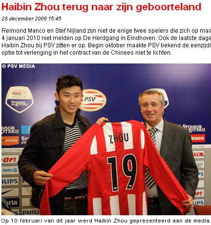 周海濱是今年2月份正式登陸PSV,并在2月17日的一場預(yù)備隊比賽中登場。雖然未能和周海濱續(xù)約,但PSV官網(wǎng)上還是對其贊賞有佳:“周海濱是PSV歷史上第二名中國球員,首位中過球員是孫祥,他也是第一個在歐冠賽場上登場的中國人。雖然周海濱沒有獲得這也的機會,但他仍然創(chuàng)造了一個記錄——他是第一個在PSV一線隊進球的中國球員,不過很遺憾他沒有代表PSV參加過正式比賽!