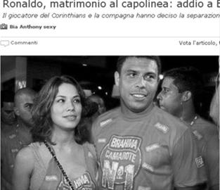 人們普遍媒兩人的情感危機(jī)還是出在“花心大蘿卜”羅納爾多身上,安東妮已經(jīng)實(shí)在無法忍受 “外星人”的頻繁出軌。羅納爾多的前幾次分手情況也和這次類似,1999年羅納爾多與米蘭妮在香港結(jié)識,同年的平安夜正式結(jié)婚,并育有一子,但羅納爾多多次的緋聞事件令兩人離婚;2005年2月羅納爾多與巴西女主播兼模特茜卡蕾莉在一個古堡中舉行了聲勢浩大的訂婚晚會,但是隨著茜卡蕾莉在羅納爾多車子的后座發(fā)現(xiàn)避孕套,兩人的婚禮被取消。