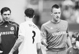 看臺(tái)上雙方球迷打出了支持各自球員的橫幅,與“特里之隊(duì)”相對(duì)的是“布里奇之隊(duì)”。開場(chǎng)后,布里奇和特里有過一次直接面對(duì)面的機(jī)會(huì)。特里在大禁區(qū)左側(cè)拿球,布里奇在防守他,雙方并沒有糾纏太久,特里草草射了一腳門了事。