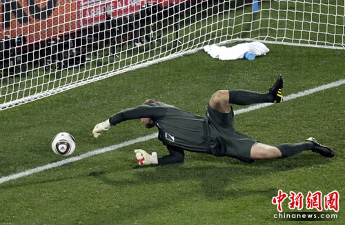 這個(gè)匪夷所思的進(jìn)球出現(xiàn)在上班時(shí)的第40分鐘,美國隊(duì)一直被英格蘭壓制,為了緩解壓力,美國隊(duì)的鄧普西漫不經(jīng)心地將球踢向英格蘭隊(duì)球門,開場后一直沒機(jī)會摸球的格林竟然有些驚慌失措,在碰了一下皮球后,皮球慢慢地滾向球門,雖然格林急忙連滾帶爬地想追上皮球,但無奈鞭長莫及,只能眼睜睜地看著皮球入網(wǎng)。