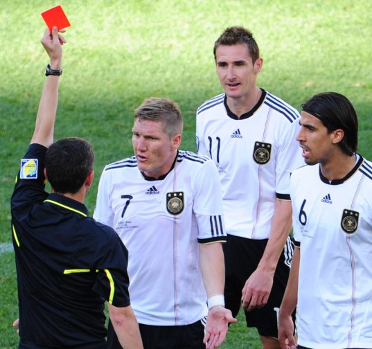 在上半場(chǎng),德國隊(duì)還占據(jù)場(chǎng)上的主動(dòng)。不過克洛澤在第12分鐘就吃到一張黃牌,而其隊(duì)友也不斷被西班牙隊(duì)出示黃牌。第37分鐘,克洛澤在防守斯坦科維奇時(shí),先鏟倒了球,這是一個(gè)可判可不判的犯規(guī),一般的裁判只會(huì)給個(gè)口頭警告。結(jié)果主裁判烏迪亞諾竟在未口頭警告的情況下,直接就出示第二張黃牌將其罰下。