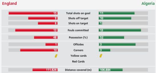 雖然英格蘭隊(duì)有魯尼、杰拉德、蘭帕德、特里等眾多大牌球星,但是他們的控球時(shí)間竟然不如對(duì)手,比對(duì)手低了4%。在越位方面,阿爾及利亞以3次領(lǐng)先于英格蘭隊(duì),可見其進(jìn)攻之心略為強(qiáng)烈。此外,英格蘭隊(duì)全場有10次角球,但都沒有轉(zhuǎn)化成進(jìn)球。