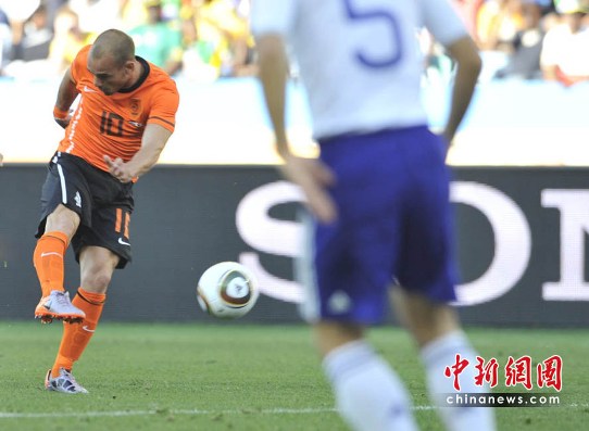 在經(jīng)歷了多半場(chǎng)比賽的僵持后,第53分鐘,“橙衣軍團(tuán)”終于撕開(kāi)對(duì)手防線,范佩西回做,斯內(nèi)德禁區(qū)外沒(méi)有停球直接大力遠(yuǎn)射,日本門將川島永嗣奮力撲救,足球碰到他的左臂彈進(jìn)網(wǎng)窩,1比0,荷蘭隊(duì)取得勝利。