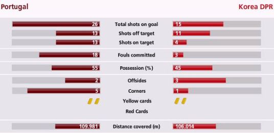 本場比賽,葡萄牙隊的射門為26次,其中13次射正門框范圍,13次射偏。朝鮮隊的射門次數(shù)也達到了15次,4腳射正11腳射偏。但是,葡萄牙隊的進攻效率明顯高于對手,最后階段的進攻幾乎是招招見血,最終以7球大勝。