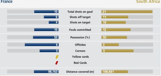 此外,雖然法國(guó)隊(duì)在大部分的比賽中都以10人應(yīng)戰(zhàn),但是其控球率卻與南非隊(duì)一樣,各為50%。越位方面,法國(guó)隊(duì)6次,兩倍于南非隊(duì)的3次。角球數(shù)字則是南非隊(duì)多于法國(guó)隊(duì),南非隊(duì)獲得了5個(gè)角球,其中一球攻破了法國(guó)隊(duì)的球門,法國(guó)隊(duì)則只有3次。