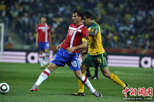 中新網(wǎng)6月24日電 今天凌晨,南非世界杯D組進(jìn)行了最后一輪的較量。塞爾維亞在內(nèi)斯普雷特的姆伯貝拉體育場(chǎng)迎戰(zhàn)澳大利亞隊(duì)。雖然澳大利亞2-1擊敗塞爾維亞隊(duì),但仍然因?yàn)閮魟偾蛄觿?shì)不敵加納,無(wú)緣小組出線。