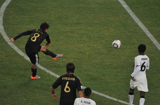 德國隊的控球時間高于對手,但是前鋒的把握機會能力差強人意。16分鐘,波多爾斯基抽射打空。加納隊的控球能力也很強,隊員們技術比較出色,反擊十分犀利。第25分鐘,德國隊獲得了開場以來最好的機會,厄齊爾拿球后單刀直入,但是面對對方門將金森,竟然將球射到對方身上,皮球被擋出。加納隊隨后也發(fā)動進攻,阿尤角球開到前點,吉安高高躍起頭球攻門,門將撲救不及,但幸好門前的拉姆護門成功,在球門線上用身體將球擋出。