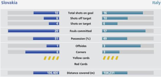 本場(chǎng)比賽,意大利隊(duì)只打了下半場(chǎng)的10多分鐘的比賽,其他時(shí)間里,竟然是斯洛伐克隊(duì)占據(jù)上風(fēng)。全場(chǎng)比賽,意大利隊(duì)射門16次,其中6次射正球門框范圍,2次攻破對(duì)手大門,1次被對(duì)方后衛(wèi)在球門線上解圍。斯洛伐克隊(duì)10腳射門只有4腳射正門框范圍,卻攻入3球!意大利隊(duì)一向引以為豪的后衛(wèi)線和門將,表現(xiàn)糟糕之極!