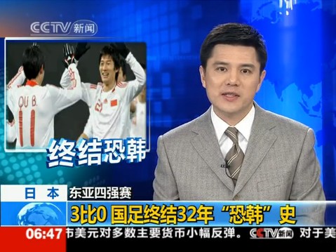 央視新聞以《3比0 國足終結(jié)32年“恐韓”史》為題,詳細(xì)的描述了三粒進(jìn)球的過程。在這段長達(dá)1分多鐘新聞中,還配有國足比賽的實(shí)況錄像和現(xiàn)場圖片。最后,新聞還簡要回顧了國足32年“恐韓癥”的歷史,并評(píng)論昨天的比賽,是以“一場完勝終結(jié)了32年的恐韓癥歷史”。