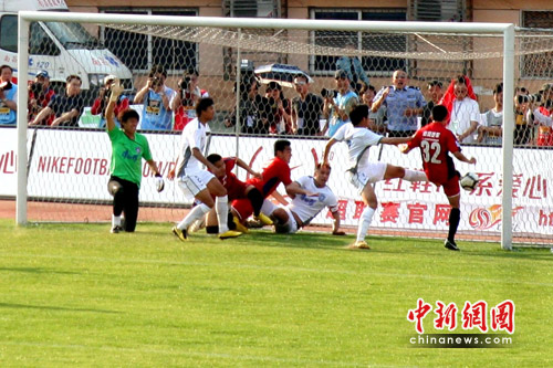 當(dāng)天下午南昌氣溫高達30度,炙熱的太陽阻擋不了主場球迷的擂鼓吶喊。比賽一開始,雙方球員就展開激烈對攻。第10分鐘,泰達隊率先取得進球,王新欣在禁區(qū)線上左腳一射踢進球門,泰達隊1-0取得領(lǐng)先。