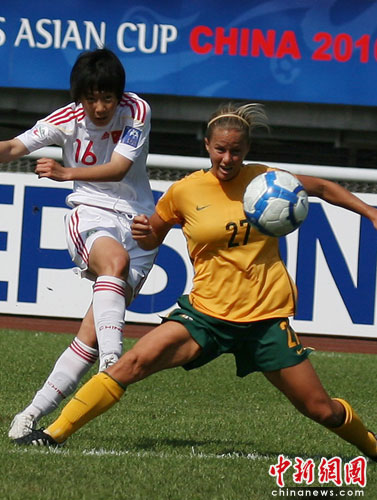 中新網(wǎng)成都5月23電(記者劉忠俊 劉賢)5月23日,2010年女足亞洲杯B小組賽中國迎戰(zhàn)澳大利亞隊(duì),比賽開后,澳大利亞占上風(fēng),中國姑娘們奮力防守,在開場9分鐘左右,中國隊(duì)16號前衛(wèi)突破對方防守,帶球攻門成功,為中國隊(duì)攻進(jìn)第一個(gè)球。