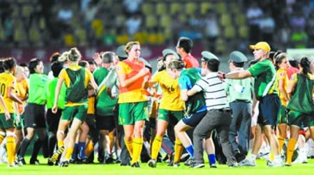 8月3日晚,中國青年女足在武漢2∶1險勝澳大利亞隊,亞青賽兩連勝提前小組出線,但在比賽結(jié)束后,雙方發(fā)生沖突,一名澳大利亞球員將中國球員張越打倒,雙方替補球員和教練見狀全部沖到場內(nèi),一片混亂之后,經(jīng)過亞足聯(lián)官員的親自協(xié)調(diào),事件才平息。據(jù)了解,澳球員之所以“發(fā)飆”,是覺得輸?shù)煤堋案C囊”,覺得“中國隊做了裁判工作”。路透社的報道說“這起事件無疑對中國足球的聲譽又是一次打擊。 ”但事實上,算上上周日中超聯(lián)賽重慶隊主教練阿里·哈恩的“瘋狂咆哮”,連續(xù)兩次都是外國教練和外國球員在中國綠茵撒野,這里必須要問一句:憑什么?