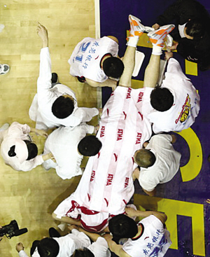 此時場邊突然沖出一名穿著黑色衣服的人員,憤怒地一拳打向查爾斯。但此人很快就被死死抱住,新疆隊的球員也圍了過來,和廣東球員互有推搡,被抱住的查爾斯怒氣未消,想找杜鋒和那位想襲擊他的人予以還擊。裁判分開雙方球員,場上砸下許多雜物,更有侮辱性的語言贈與查爾斯。在槍林彈雨中,查爾斯被新疆隊的球員和部分警衛(wèi)簇擁著離開球場。球場十分混亂。