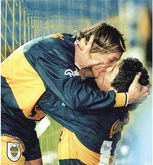 阿根廷人的豪放這一刻展現(xiàn)得淋漓盡致,主角是球王和風(fēng)之子。當(dāng)時(shí)風(fēng)之子接到球王的妙傳破門得分,兩個(gè)人當(dāng)場(chǎng)不顧全場(chǎng)所有觀眾和其他的隊(duì)友激吻在一起,長(zhǎng)達(dá)6分鐘,而且還是“舌吻”!當(dāng)時(shí)引起了全世界的轟動(dòng)!好戲還在后頭:卡尼吉亞的老婆說(shuō):“馬拉多納是同性戀,他喜歡親吻卡尼吉亞的嘴唇!碑(dāng)然老馬很生氣,但是他表示:“看在卡尼吉亞的份上就不追究了!”