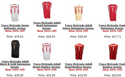 我們不得不注意一個(gè)事實(shí):麥克·詹姆斯的球衣,在交易前兩天以半價(jià)出售;“棒子”威爾斯和阿爾斯通的球衣在交易同一天被半價(jià)出售……打開火箭官方商店的網(wǎng)站,我們可以清楚的看到,麥迪系列的球衣已經(jīng)被擺上了大甩賣貨架,一律五折出售。