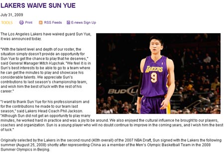 中新網8月1日電 當?shù)貢r間7月31日,NBA上賽季冠軍湖人隊通過官方網站,宣布放棄來自中國的后衛(wèi)孫悅。
