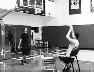 每天姚明都重復(fù)同樣的動(dòng)作——坐車來(lái)到豐田中心,拄拐換乘擺渡車,拄拐來(lái)到訓(xùn)練場(chǎng),然后由甘寧幫他搬兩把椅子,一把給姚明坐著,一把給他放左腳。這兩把椅子每天要被擺在三個(gè)地方:正對(duì)籃下大約在罰球區(qū)的位置和兩個(gè)45度角。在每個(gè)位置上,姚明要進(jìn)行100個(gè)投籃練習(xí),每組投25個(gè),分4組完成每個(gè)點(diǎn)的訓(xùn)練量。