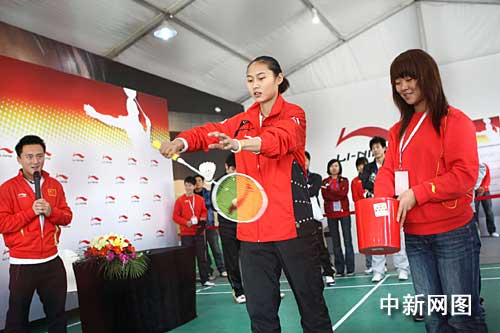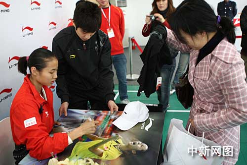 中新網(wǎng)上海十一月二十二日電(宗晨亮)二十二日,2009年中國公開賽進(jìn)入決賽日。已經(jīng)結(jié)束比賽任務(wù)的王儀涵在李寧互動體驗區(qū)參加與球迷的互動活動,之后還她為球迷簽名留念。