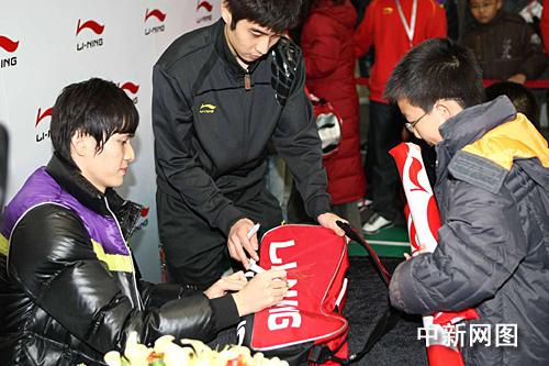 中新網(wǎng)上海十一月二十三日點(宗晨亮)日前,中國羽毛球名將鮑春來來到“2009李寧・中國羽毛球公開賽”球迷體驗區(qū),和球迷們進行了互動活動,還為大家簽名留念。有意思的是,小鮑的球迷多數(shù)都是女性,主持人也拿此事和他開玩笑。