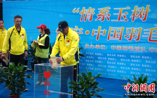 比賽開始前,中國羽毛球隊全體運動員、教練員和工作人員為玉樹災區(qū)進行現場捐款。此外,此次賑災義賽得到眾多企業(yè)的支持,恒安國際集團捐款50萬元人民幣,李寧(中國)體育用品有限公司、北京夢奧公司(聯邦快遞)、紅牛維他命飲料有限公司、喜得龍(中國)有限公司分別捐款10萬元。