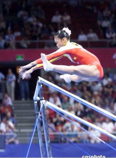 中國女子體操選手董芳霄2000年9月十九日在悉尼奧運(yùn)會(huì)女子體操團(tuán)體賽高低杠比賽中。 中新社發(fā) 李剛 攝