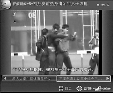 當劉翔脫下白色外套換上釘鞋,準備開始練跨欄時,一個穿黑色上衣,背著運動包的陌生男子,從劉翔身后一下子把他抱住,臉上還露出了莫名的微笑,一副幸福的表情。這個怪異得近乎詭異的舉動一下子把劉翔給惹火了,此前還一臉放松的飛人,一下子板起面孔,雙手用力一揮把男子推開,向前走了兩步之后嘴里還忍不住嘟囔了幾句。