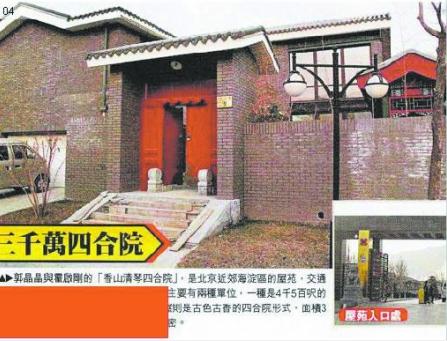 現(xiàn)在,越來(lái)越多的跡象都在表明郭晶晶和霍公子的婚期已近。昨天,香港一媒體爆出郭晶晶正準(zhǔn)備裝修去年霍家所贈(zèng)的價(jià)值3000萬(wàn)人民幣的豪華別墅,并稱(chēng)“這很有可能就是他們倆在北京的婚房!”據(jù)說(shuō),這套別墅位于北京海淀區(qū)四季青鎮(zhèn)門(mén)頭村,在五環(huán)以外。據(jù)記者了解,該樓盤(pán)的中式院落獨(dú)棟別墅面積為300—550平米之間,另外,每棟別墅送150平米的地下室。該別墅在2007年的預(yù)估開(kāi)盤(pán)價(jià)就高達(dá)55000—60000元/平米。難怪媒體都將這一帶的房子稱(chēng)作“北京頂級(jí)私人豪宅群落!