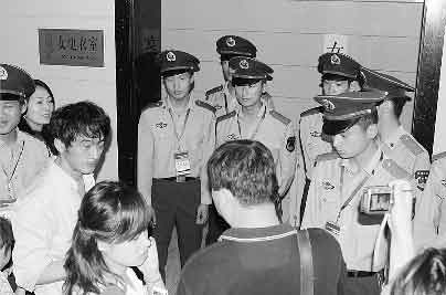 郭晶晶是否真的去找吳敏霞了?這個記者并不清楚,不過據(jù)記者了解吳敏霞不出席新聞發(fā)布會是因?yàn)楹ε卤弧罢`傷”。在郭晶晶第一次離開新聞發(fā)布會現(xiàn)場時,記者也跟了出去。吳敏霞當(dāng)時剛剛接受完央視的采訪正準(zhǔn)備走進(jìn)更衣室,但此時竟然有一位簽名的男FANS跟著吳敏霞走進(jìn)了更衣室,不過好在現(xiàn)場武警反應(yīng)迅速,將他“揪了”出來。見現(xiàn)場形勢已經(jīng)非;靵y,武警索性集體站在了女更衣室的門口,一位現(xiàn)場工作人員邊打著電話,邊嚷著“守好,誰都不讓進(jìn)去”。