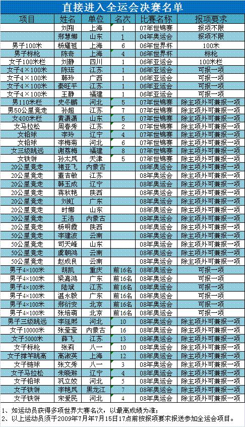 7月10日,中國田徑協(xié)會公布了直接進(jìn)入全運(yùn)會決賽的田徑運(yùn)動員名單。劉翔、邢慧娜、黃瀟瀟、周春秀等45名選手列入名單。入選名單的運(yùn)動員還必須在2009年7月15日17時前,按報名項目要求報送參加全運(yùn)會比賽的報名申請。