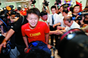張琳推著行李車,走在運動員隊伍的最前面,他接連接過兩束鮮花。攝影記者將他團團圍住,閃光燈閃爍個不停。昨天中午,中國游泳隊載譽返京,在首都機場張琳成為最受關(guān)注的明星。接受采訪的間隙,還忙著給粉絲簽名。