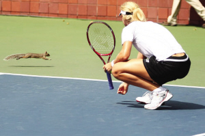 昨天中午,正當眾多大腕在訓練場進行最后練習的時候,一只松鼠突然闖入訓練場。突然面對這么多人、還有這么多來回移動的網(wǎng)球,受到驚嚇的小松鼠有些不知所措。在場地周圍來回奔跑,甚至橫穿了德娃正在訓練的球場。中途,它還遇到一只網(wǎng)球擋路,它還不得不跟網(wǎng)球“搏斗”了一番,引得場外球迷的一片驚訝聲。