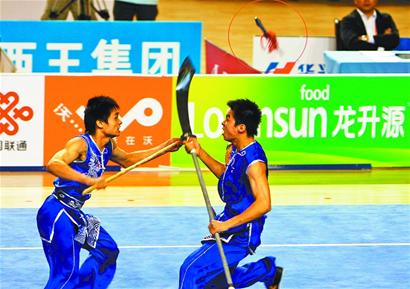 本以為昨天的兩次斷棍事故會(huì)給所有參賽隊(duì)敲響警鐘,但通過今晚的比賽來看,起碼廣西隊(duì)和已經(jīng)出現(xiàn)過一次事故的四川隊(duì)并沒有重視比賽器材的選擇和維護(hù)。在男子對(duì)練比賽中,廣西隊(duì)的黃俊華/黃杰第三個(gè)出場,他們表演的項(xiàng)目是樸刀進(jìn)槍,也就是長刀與長槍的對(duì)抗。比賽進(jìn)行到了一半,黃俊華一刀砍向使槍的黃杰,長槍抬起格擋時(shí)意外發(fā)生,長槍的木桿與刀刃接觸后立刻斷為兩截,廣西隊(duì)本項(xiàng)比賽沒有獲得成績。