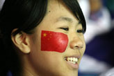亞運會舉重賽場的看臺上,孩子們臉上貼著亞運標(biāo)志觀看比賽。