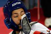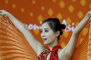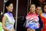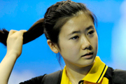 臺球女子美式8球單打亞軍、韓國選手金佳映,參加頒獎(jiǎng)儀式前,饒有興致地向禮儀小姐學(xué)習(xí)儀態(tài)。