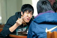 劉翔迅速返回公寓,套上帽衫,陽光很燦爛,劉翔很愜意,他“大搖大擺”、仰著頭,輕哼著流行歌走向食堂!皝砹税!”一走進二樓田徑隊的飯?zhí)茫⒓从袕N師倍兒親切地招呼他,劉翔笑著說“餓了”?鐧诮M幾個人坐到東北角,這是他們的“老地方”。接著劉翔和大伙兒一起排隊,盛上青菜、棒骨、肉末燉粉條、炒雞蛋和白米飯,又拿了個柚子。