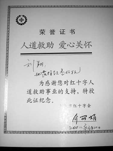 劉學(xué)根說(shuō),他晚上還要打電話告訴劉翔,自己在紅十字會(huì)被深深感動(dòng)了!拔覜]想到有那么多人到這里來(lái)捐款,全都是默默無(wú)聞的,進(jìn)來(lái)捐了錢就走了,他們都很讓人感動(dòng)!逼鋵(shí),老劉走進(jìn)紅十字會(huì)時(shí),也沒張揚(yáng),默默排隊(duì),默默捐款,只是因?yàn)榫杩顢?shù)額比較大,又因?yàn)榫杩钊耸恰皠⑾琛,才被人認(rèn)了出來(lái)!按蠹叶际侵г疄(zāi)區(qū)的普通人,都是在盡自己一份力量”,老劉說(shuō)。