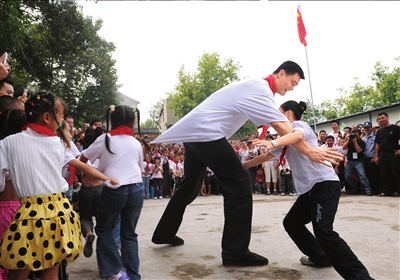 游戲開始了,一位高年級(jí)同學(xué)當(dāng)老鷹,姚明則當(dāng)雞媽媽,其他的同學(xué)做小雞。姚明張開雙臂,彎著身子,直視前方,掩護(hù)著正在身后休息的孩子們。不一會(huì)兒,兇猛的“老鷹”如猛虎出山似地飛過來,用左晃晃、右看看,想要出擊卻找不到合適的機(jī)會(huì)。正當(dāng)大家有些松懈的時(shí)候,“老鷹”猛地一陣,展開有力的翅膀向姚明身后的孩子們發(fā)動(dòng)了襲擊。姚明左顧右盼,進(jìn)行有力阻擋,但是一不留神,后面的孩子們突然掉隊(duì)!袄销棥表槃(shì)活捉了離隊(duì)的孩子們!翱靵砭任遥 甭牭胶⒆觽兊暮艉,姚明立即轉(zhuǎn)了方向,趕走身后的“老鷹”。場(chǎng)上玩的開心,場(chǎng)下也看得開心,加油聲、歡笑聲回蕩在小小的校園內(nèi)。兩個(gè)回合下來,雖然有些疲倦,但是姚明和小孩們都還不盡興,再次回到場(chǎng)內(nèi)過把癮。當(dāng)裁判老師一聲哨響宣布結(jié)束時(shí),姚明才有些戀戀不舍地回到了座位。(徐楊 陶玲 彭晗)