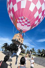 彩排中一個(gè)巨大的熱氣球無(wú)疑是最大焦點(diǎn),氣球上寫(xiě)著“云中漫步”四個(gè)大字,待熱氣球緩緩升起,記者才看明白,原來(lái)是楊云和伴娘孫曉姣兩人將在空中來(lái)一趟“云中漫步”。具體過(guò)程是,楊云和孫曉姣在工作人員的幫助下,熱氣球從百米開(kāi)外的一處小碼頭“漫步”到愛(ài)情廣場(chǎng)上空,等待楊威和國(guó)家體操隊(duì)的5名“黃金”伴郎的到來(lái)。