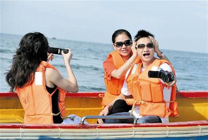 當(dāng)然,昨日彩排的時(shí)候,5位伴郎還沒(méi)有抵達(dá)三亞,而且楊威的海上旅程和楊云的空中旅程分開(kāi)彩排。因此,在這一環(huán)節(jié),楊威、楊云和孫曉姣同坐一條艇,而本報(bào)兩名記者和楊威、楊云的隨行人員則客串伴郎分乘另外三條艇,來(lái)了一次海上“漫步”。