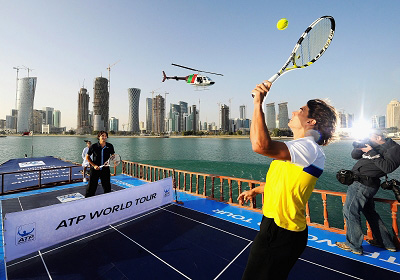 2009年,ATP(國際職業(yè)網(wǎng)球聯(lián)合會)推出了全新的世界巡回賽,為宣傳這一嶄新的賽事,ATP官方昨天請到了當(dāng)今世界男子網(wǎng)壇兩大天王納達(dá)爾和費(fèi)德勒,讓他們在多哈一艘傳統(tǒng)的阿拉伯帆船上進(jìn)行了一場網(wǎng)球賽。波斯灣上的帆船上,世界上最優(yōu)秀的兩位球員踏上特制的賽場,為ATP世界巡回賽的起航而揮拍。