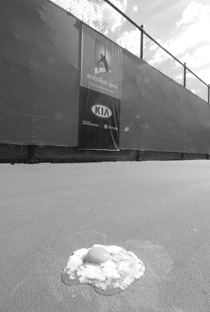 果然,昨天一大早,炙熱的陽光便烤得人們頭昏眼花,氣溫也很快躥升到40攝氏度以上,使得整個(gè)墨爾本像一個(gè)大火爐。據(jù)報(bào)道,墨爾本郊外的鐵軌在烈日暴曬下,部分已經(jīng)變形,火車因此延誤。有記者在賽場中央試著打了個(gè)雞蛋,沒想到雞蛋竟被煎熟了。