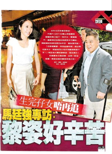 記者問(wèn)他有沒(méi)有進(jìn)產(chǎn)房陪太太,馬廷強(qiáng)說(shuō):“我沒(méi)進(jìn)產(chǎn)房。黎姿要打麻醉針,加上我拄著拐杖,不是很方便,所以留在產(chǎn)房外等。她生完BB后從手術(shù)室出來(lái),我就立刻去看她。”