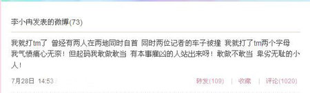 最近福建兩位記者因揭露“紫金礦業(yè)”,結果在同一天兩位記者的車子同時被撞。李小冉尤其關注這則新聞,她在昨日中午的微博中發(fā)飆:“天災就夠叫人無奈的了,人禍也是沒完沒了!彼 在微博中爆粗口,引來粉絲圍觀,認為其有損形象。